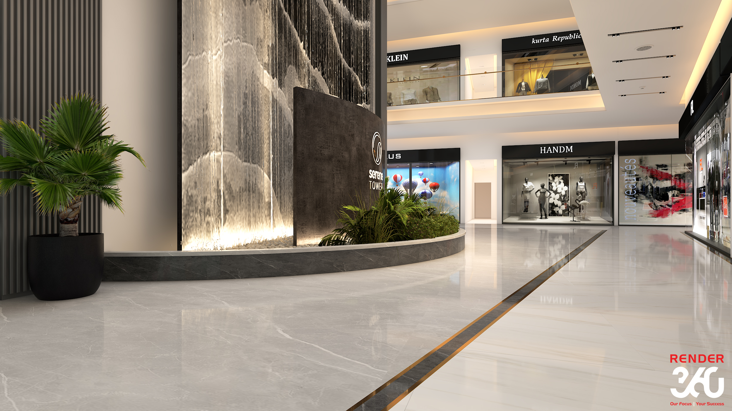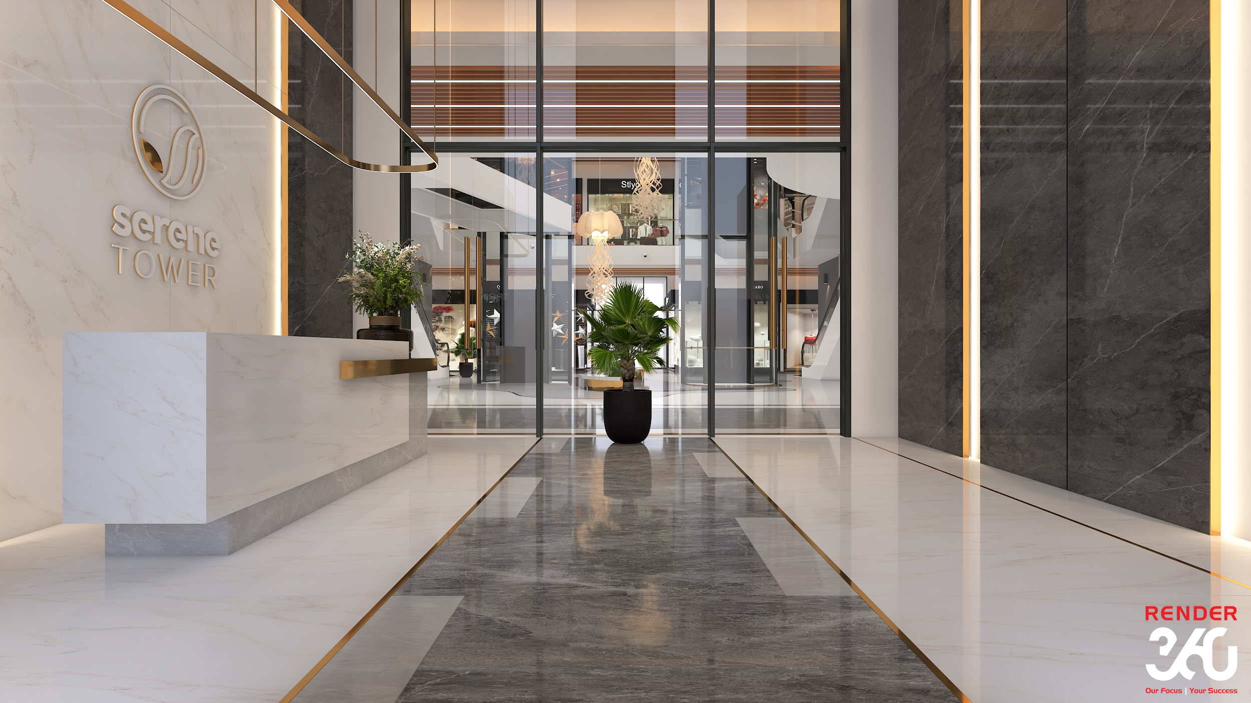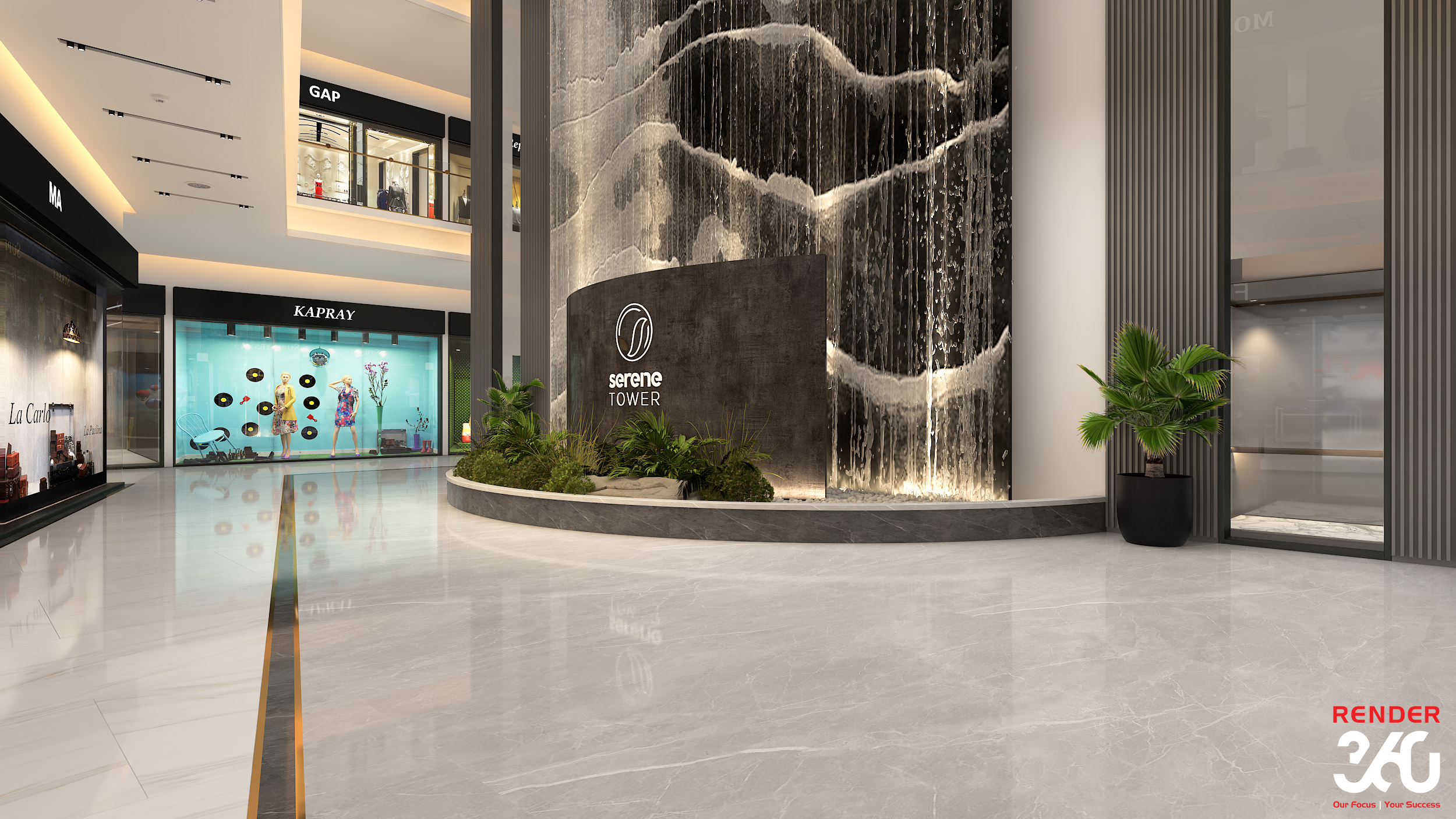 The VR Tour of Serene Tower offers an immersive experience that allows viewers to explore the project as if they were physically walking through it. From the moment the tour begins, visitors are welcomed into a grand, double-height lobby featuring elegant marble finishes, warm lighting, and a sophisticated ambiance that sets the tone for the entire development. As the tour continues, it smoothly transitions through the commercial floors, where modern retail shops and open spaces highlight Serene Tower’s focus on premium design and accessibility.